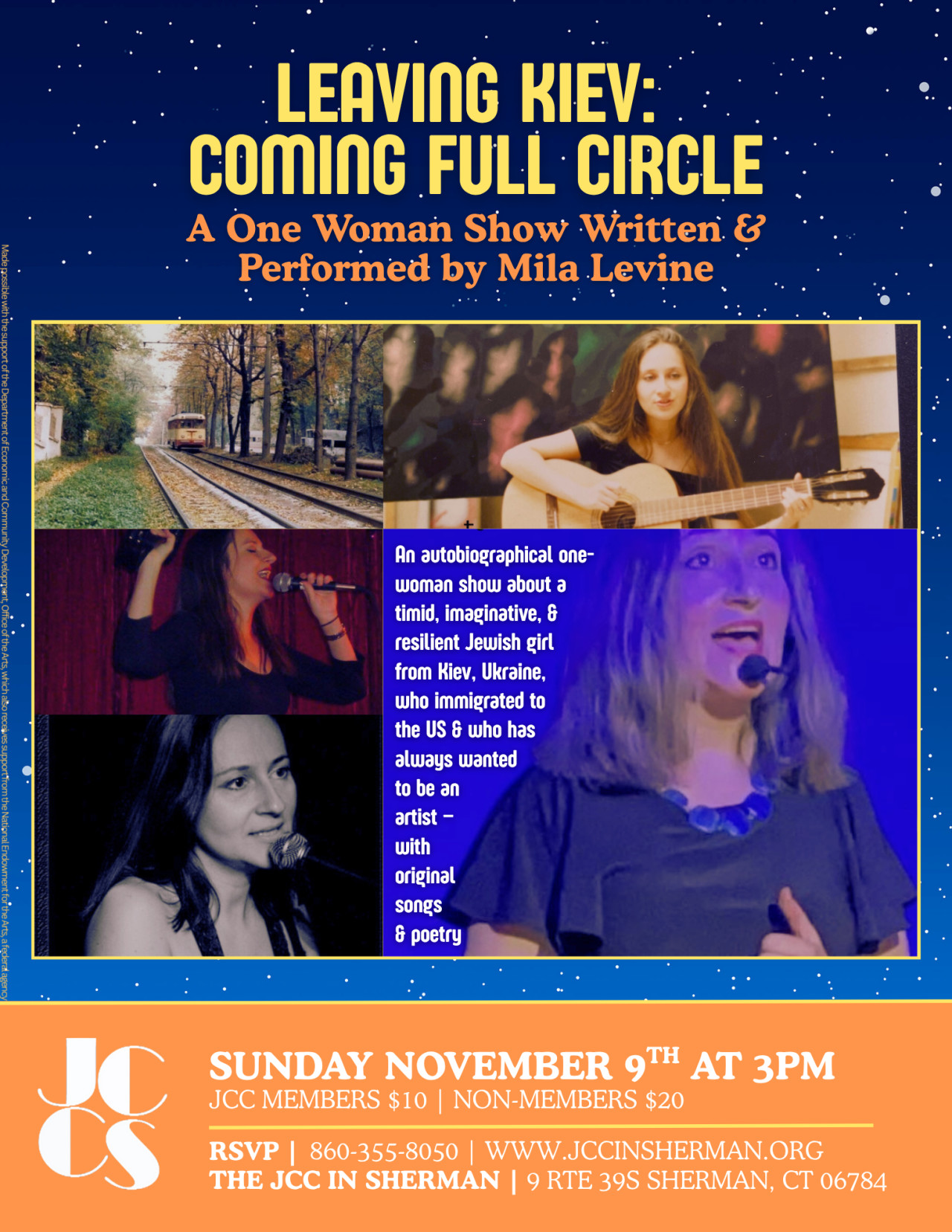 Her latest theatrical production, Leaving Kiev: Coming Full Circle, weaves together elements from her previous autobiographical performances and features several of her original songs in both Russian and English. Spanning decades—from her childhood in Ukraine to her life in the United States—this powerful piece has earned acclaim from audiences and critics alike following performances throughout New York City and Westchester. Mila is thrilled to bring her work to Connecticut and share it with the JCC of Sherman audience.